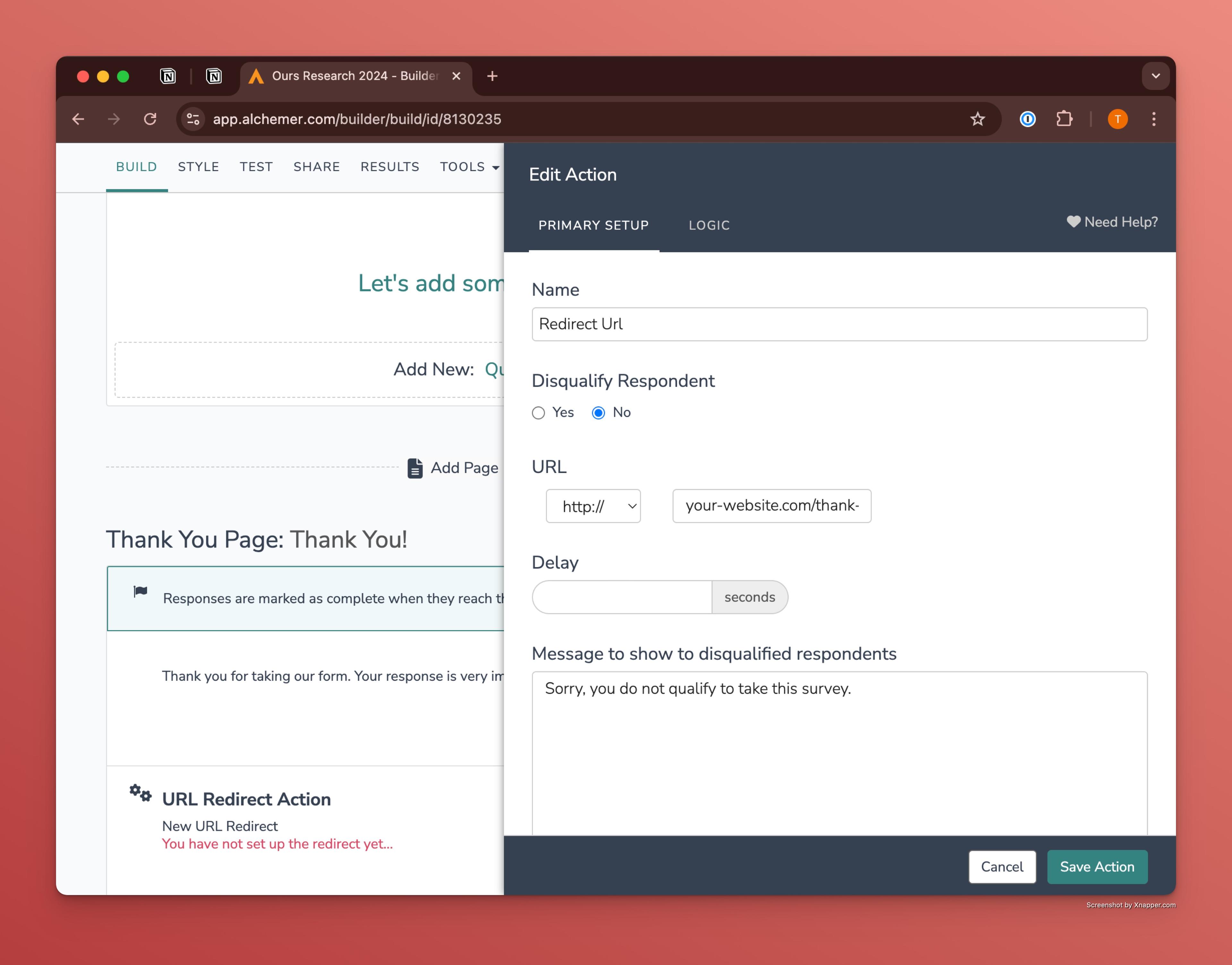 The simplest way to integrate Ours with Alchemer is to set up a redirect after survey completion. Here's how: