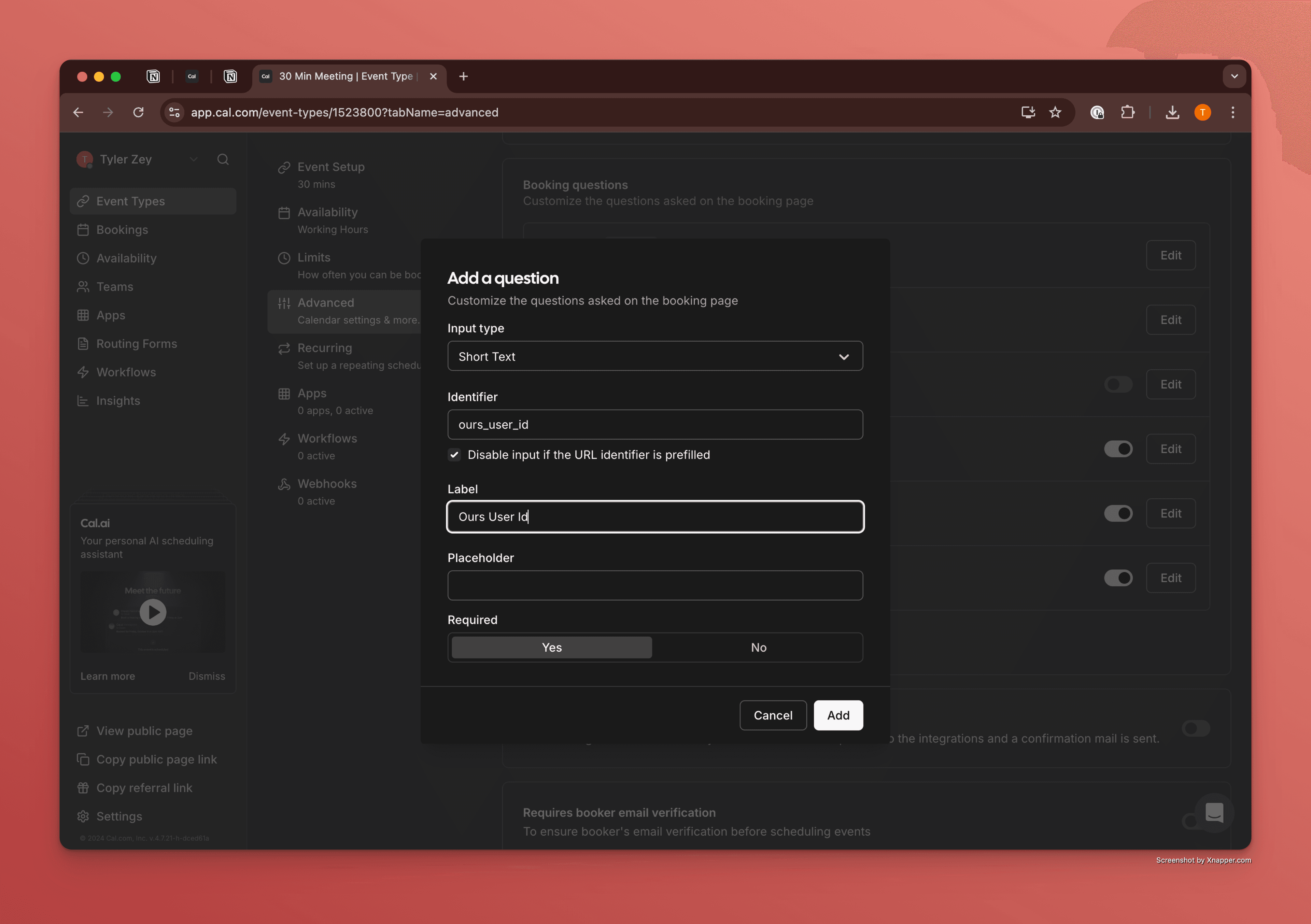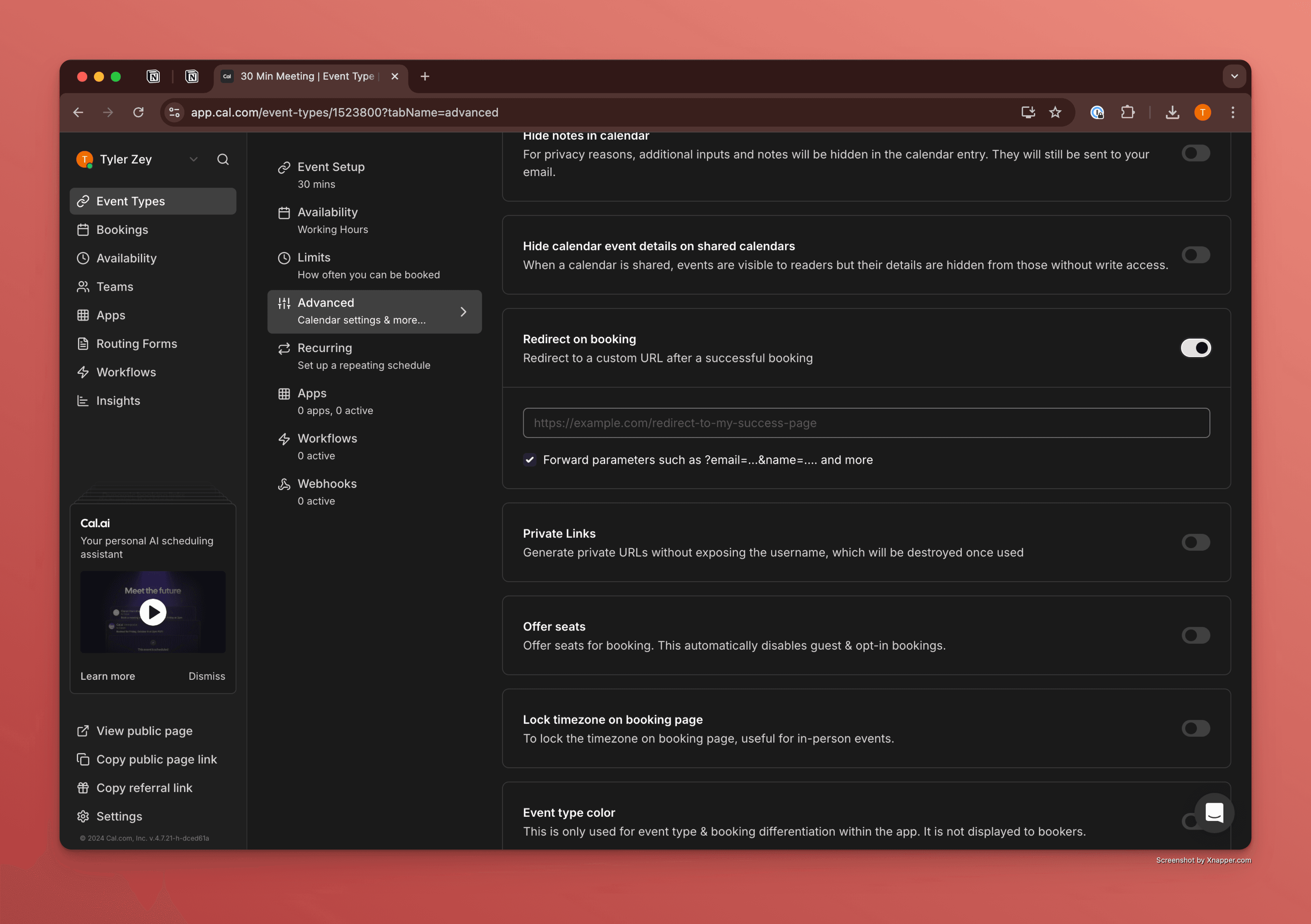 The simplest way to integrate Ours with Cal.com is to set up a redirect after booking. Here's how: