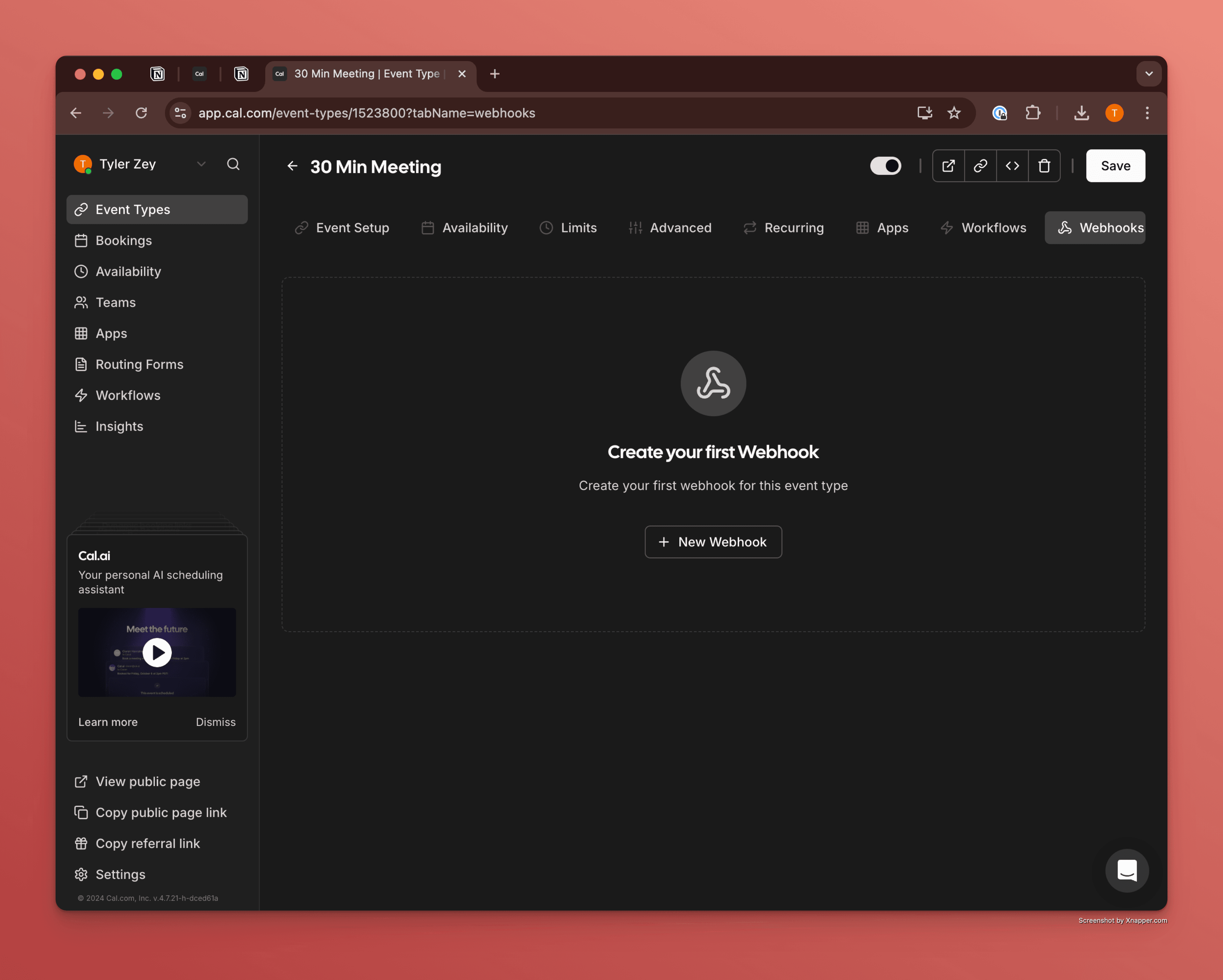 - Select Cal.com from the options and copy the Webhook URL provided.