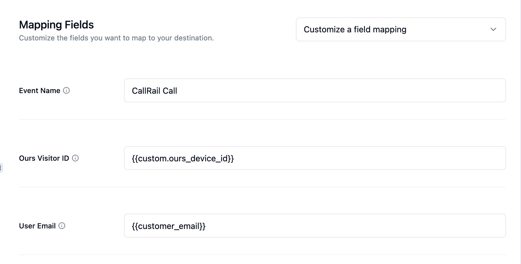 - Use the field mapping interface in Ours Privacy to map CallRail event data to Ours Privacy attributes.