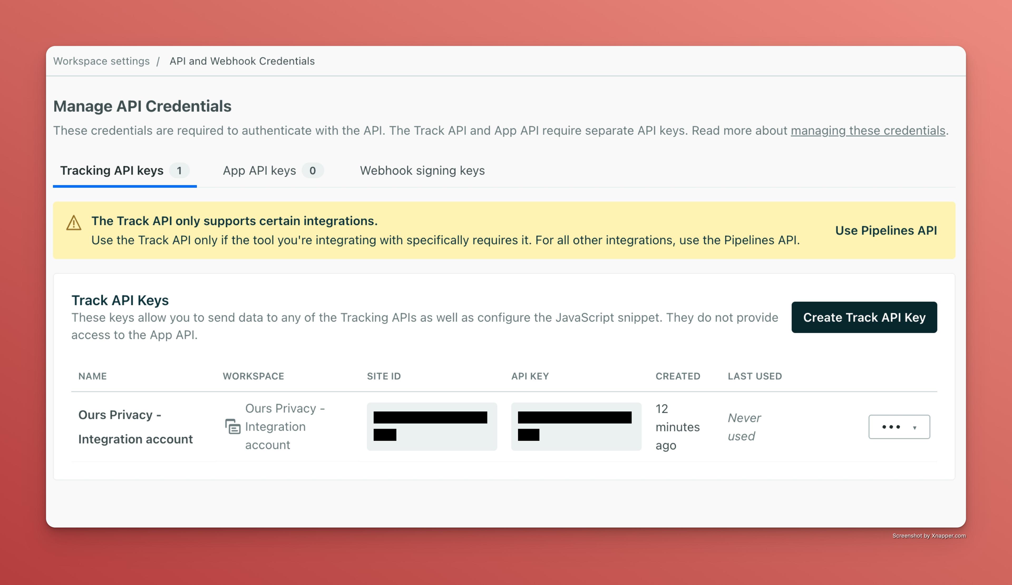- Copy the API key and Site ID into your Ours Privacy integration settings