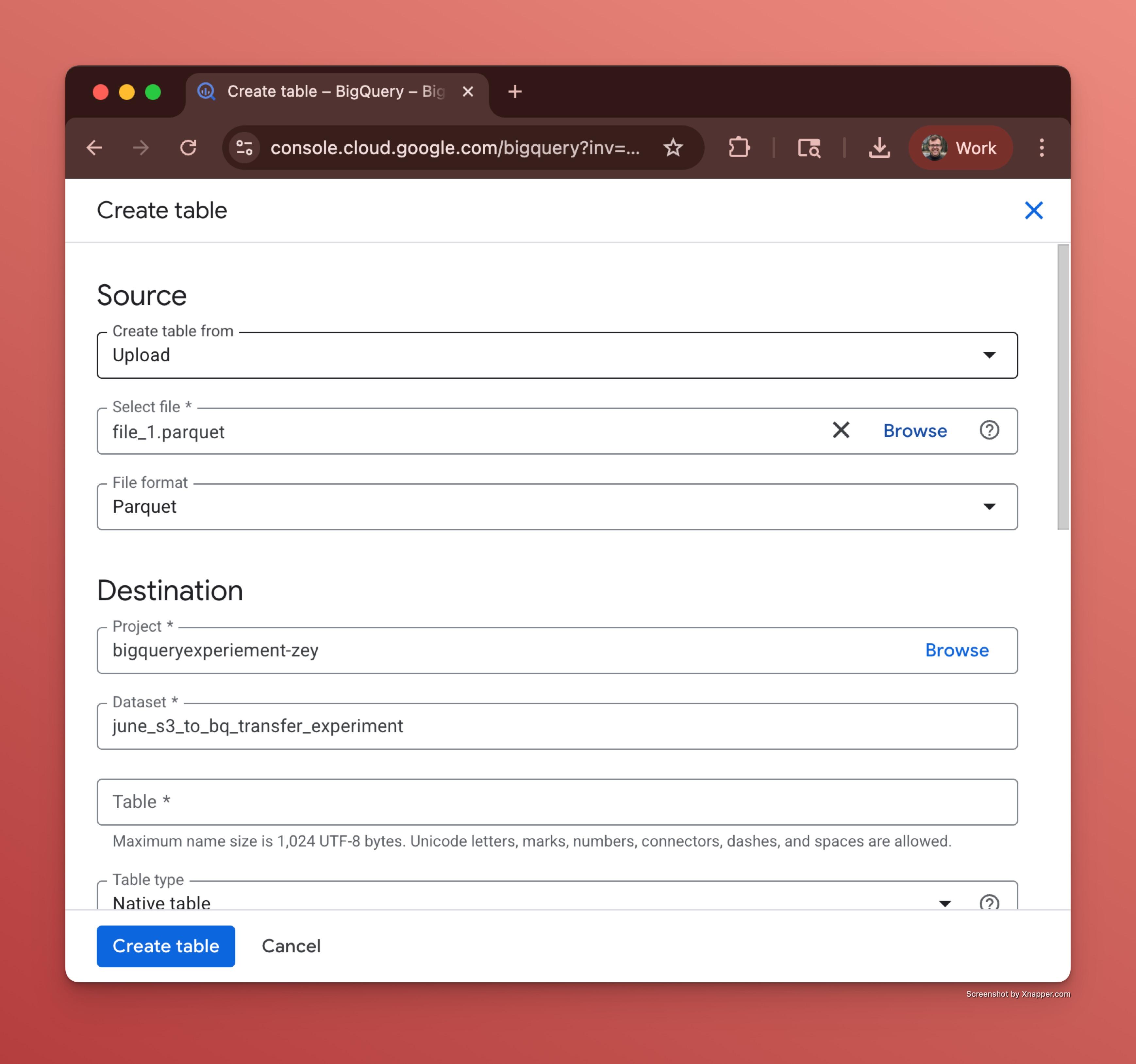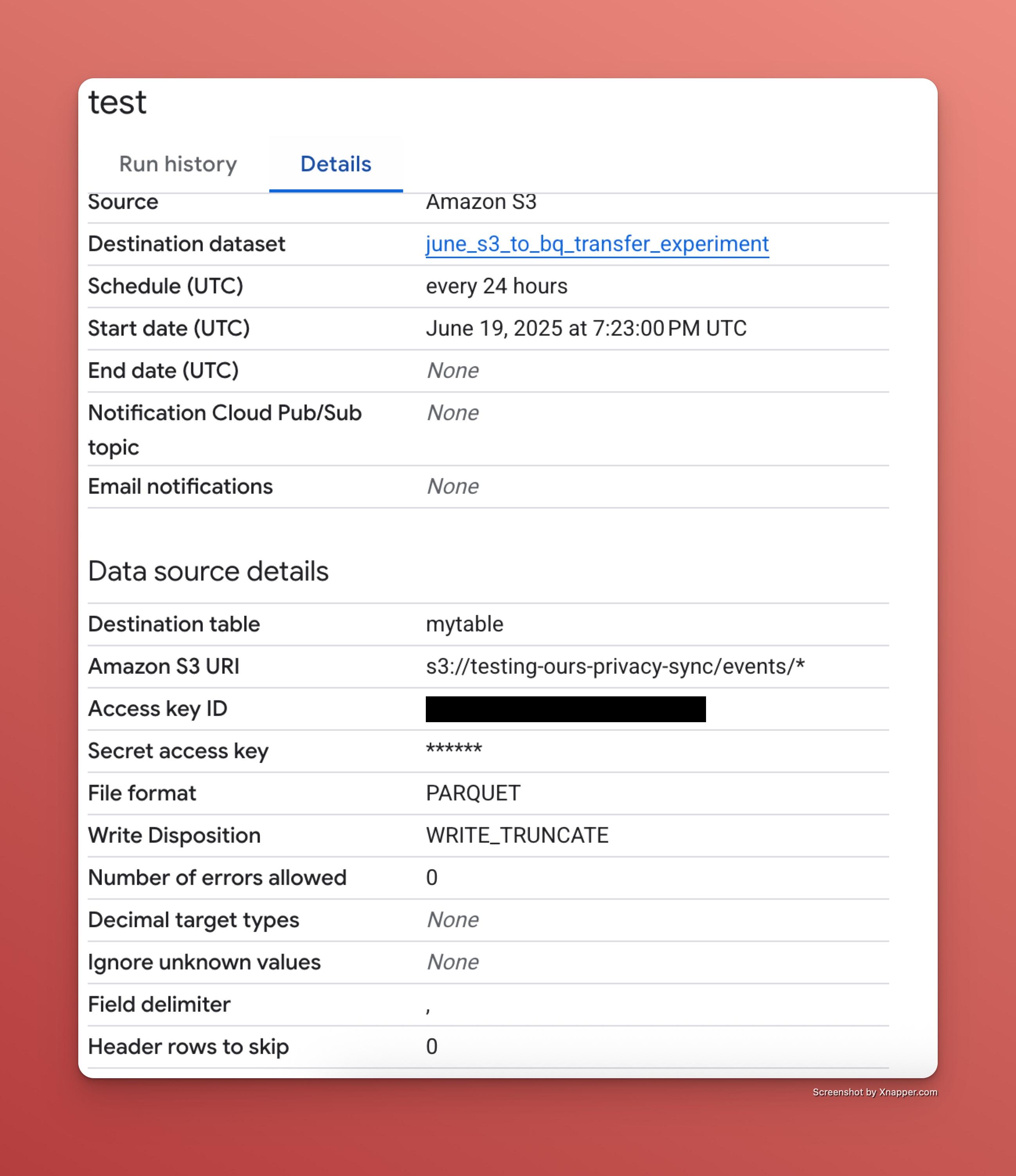 Note: This is the simplest way to get started without daily partitioning. The Ours Privacy data sync is well-configured for partitioning. For advanced partitioning options, see the BigQuery transfer documentation.
