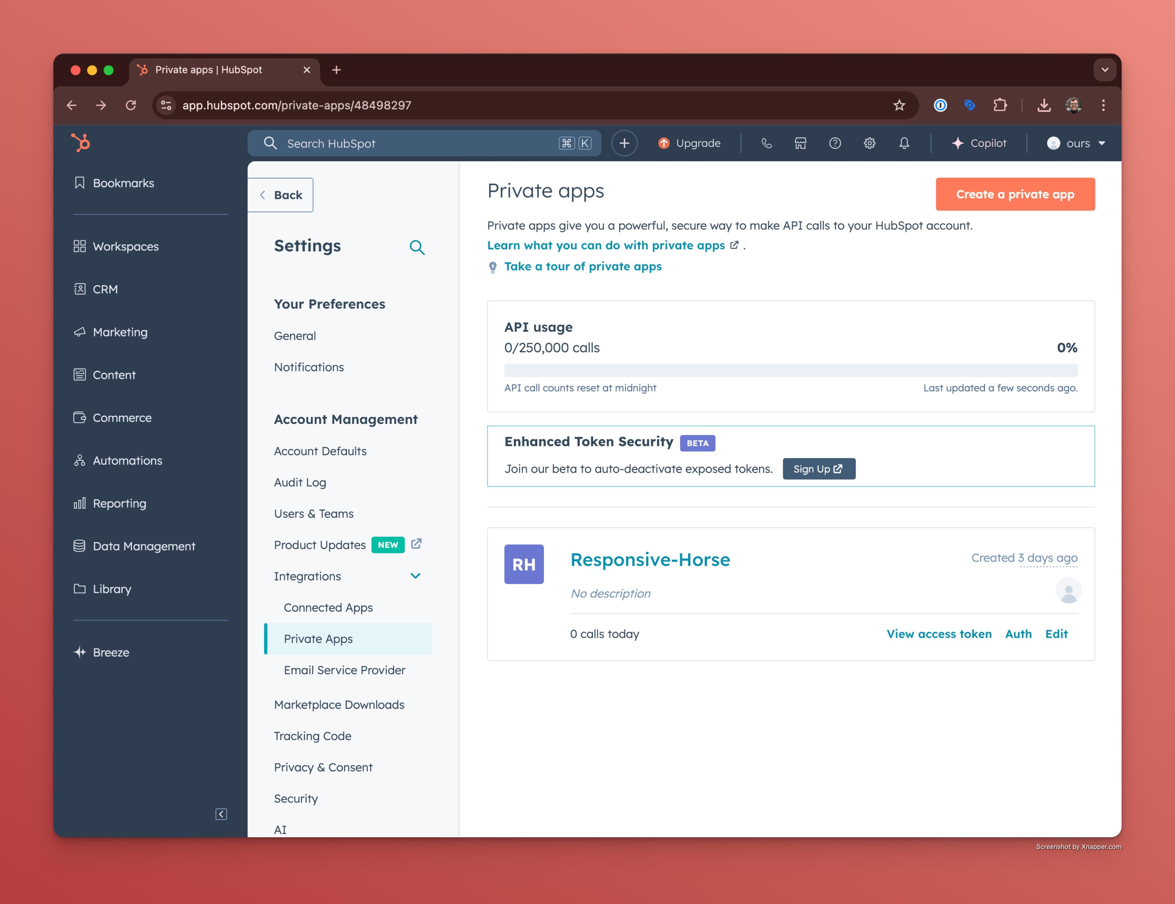 - Navigate to your HubSpot Settings and find "Private Apps"