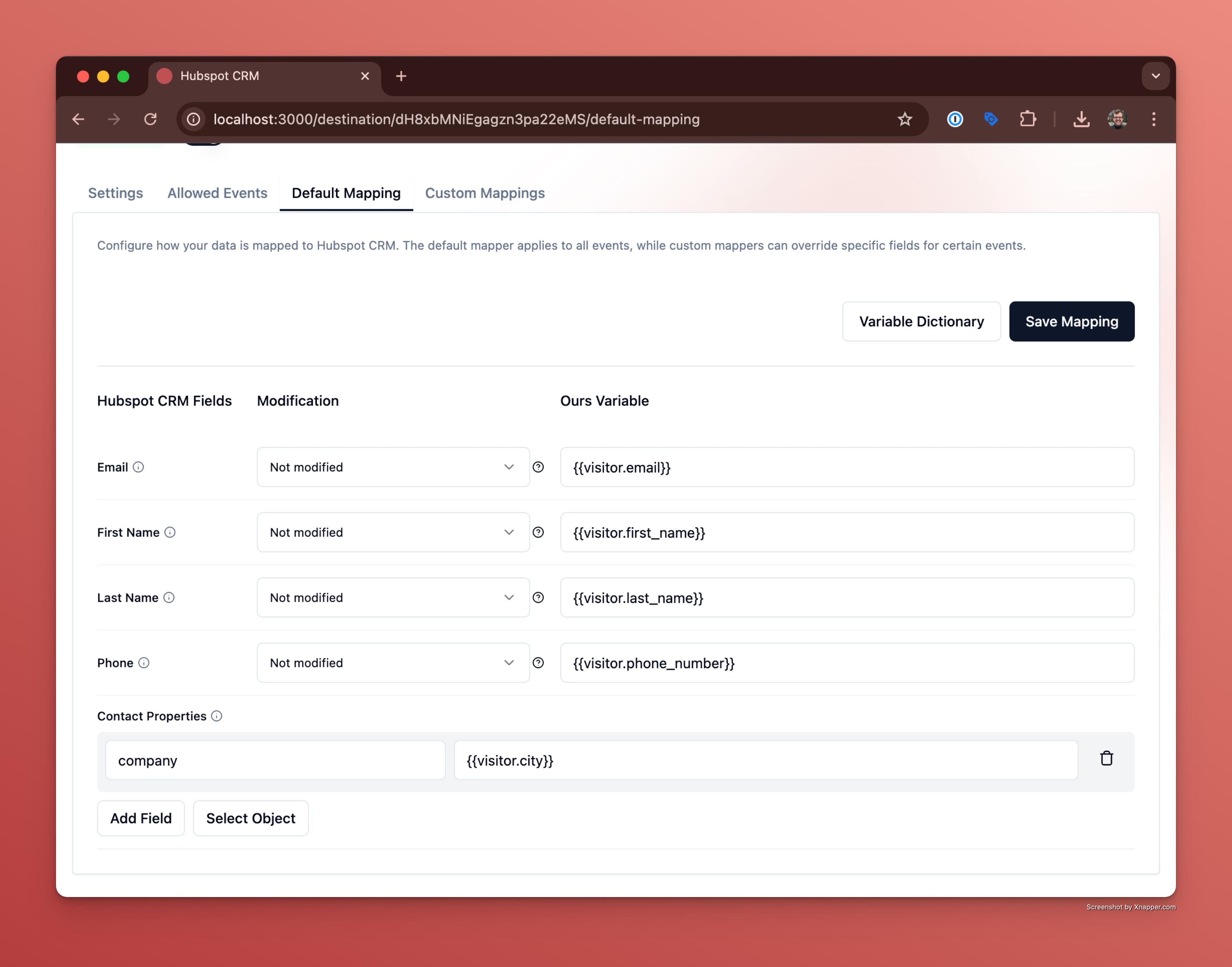The HubSpot integration allows you to create or update contacts in your HubSpot CRM based on visitor events. This integration requires an email address to be associated with the visitor for proper contact identification.