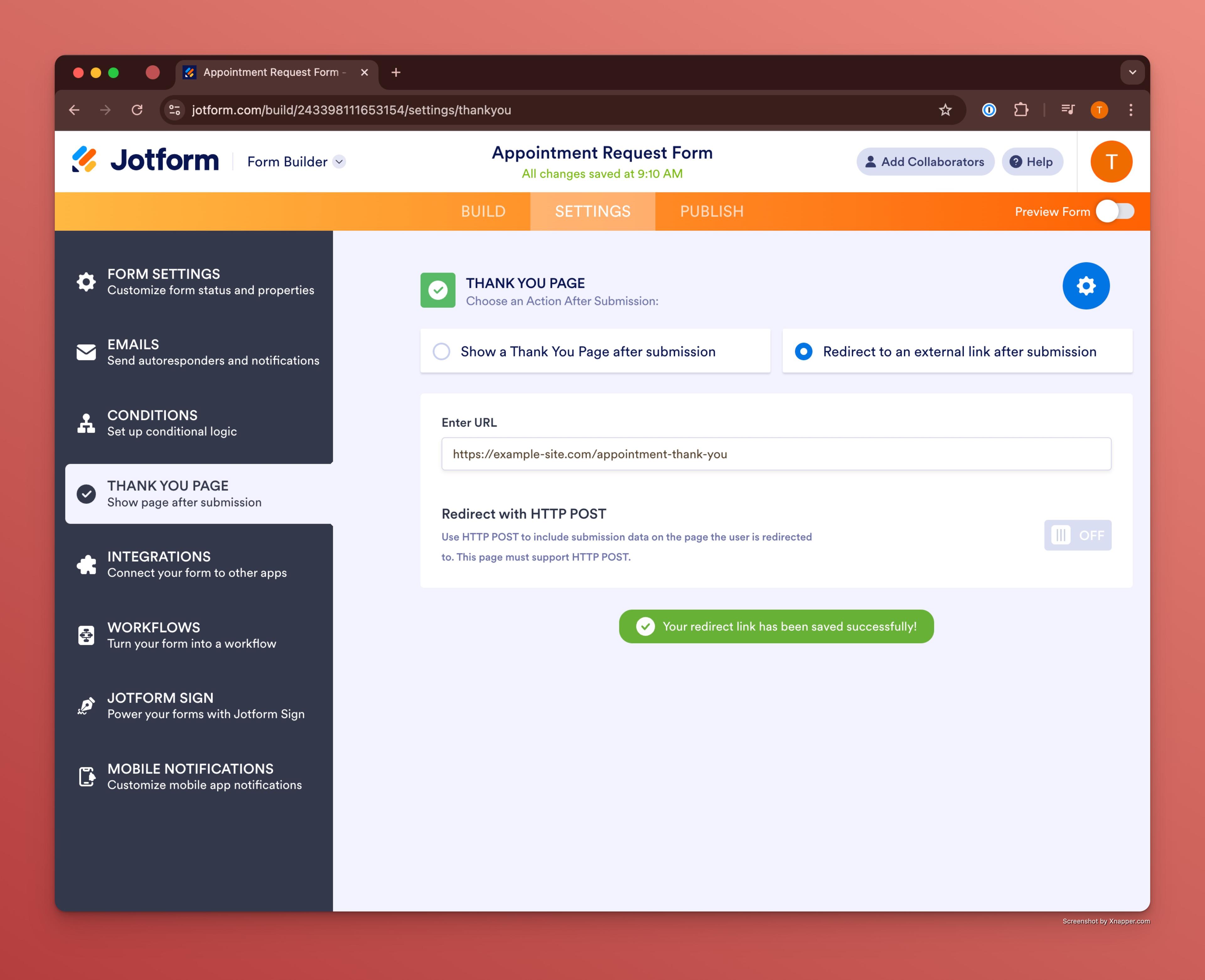 The easiest way to integrate Ours with JotForm is to use a redirect within JotForm. To do this: