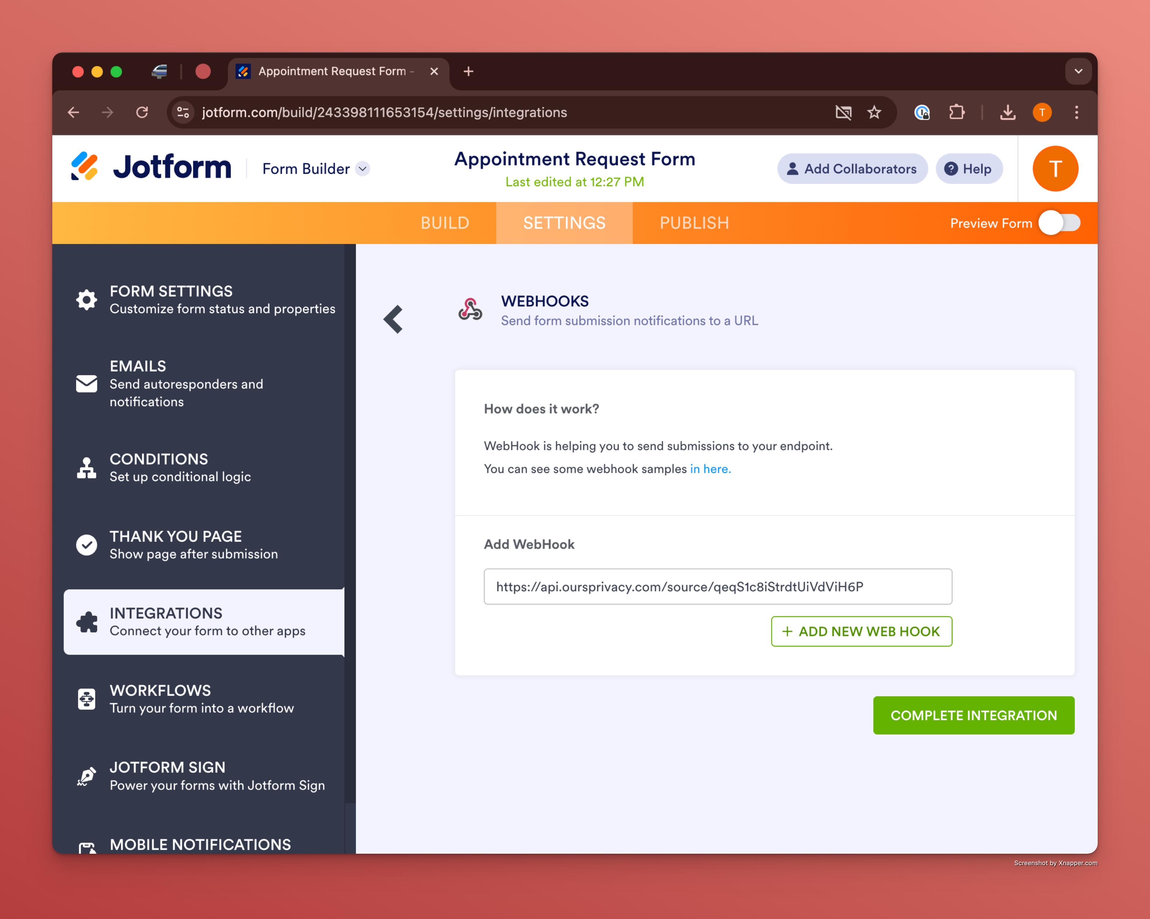 Then, copy/paste the Webhook URL into your JotForm form settings: