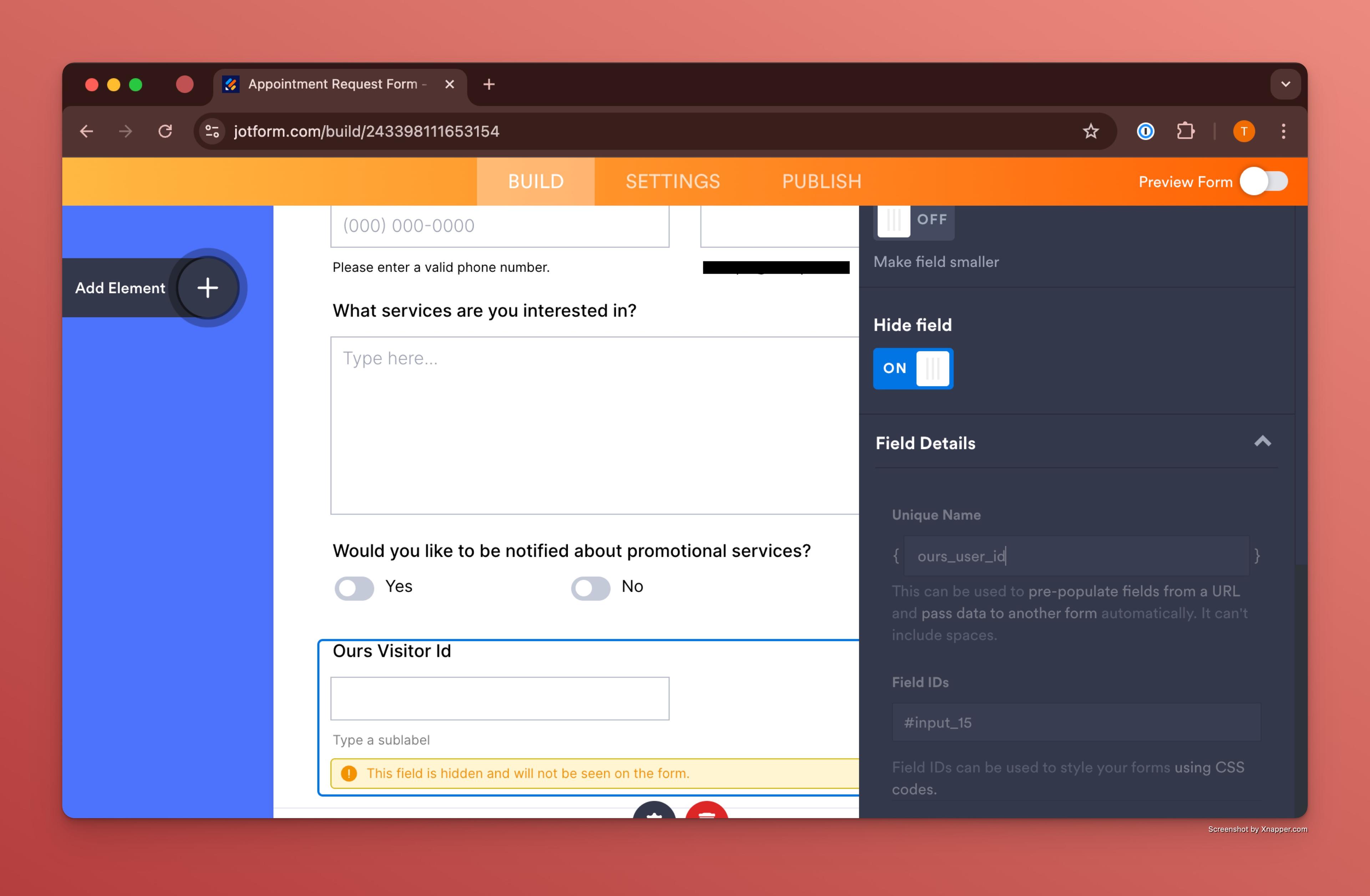 - You'll want to pass the visitor id to JotForm via the URL to properly identify the user