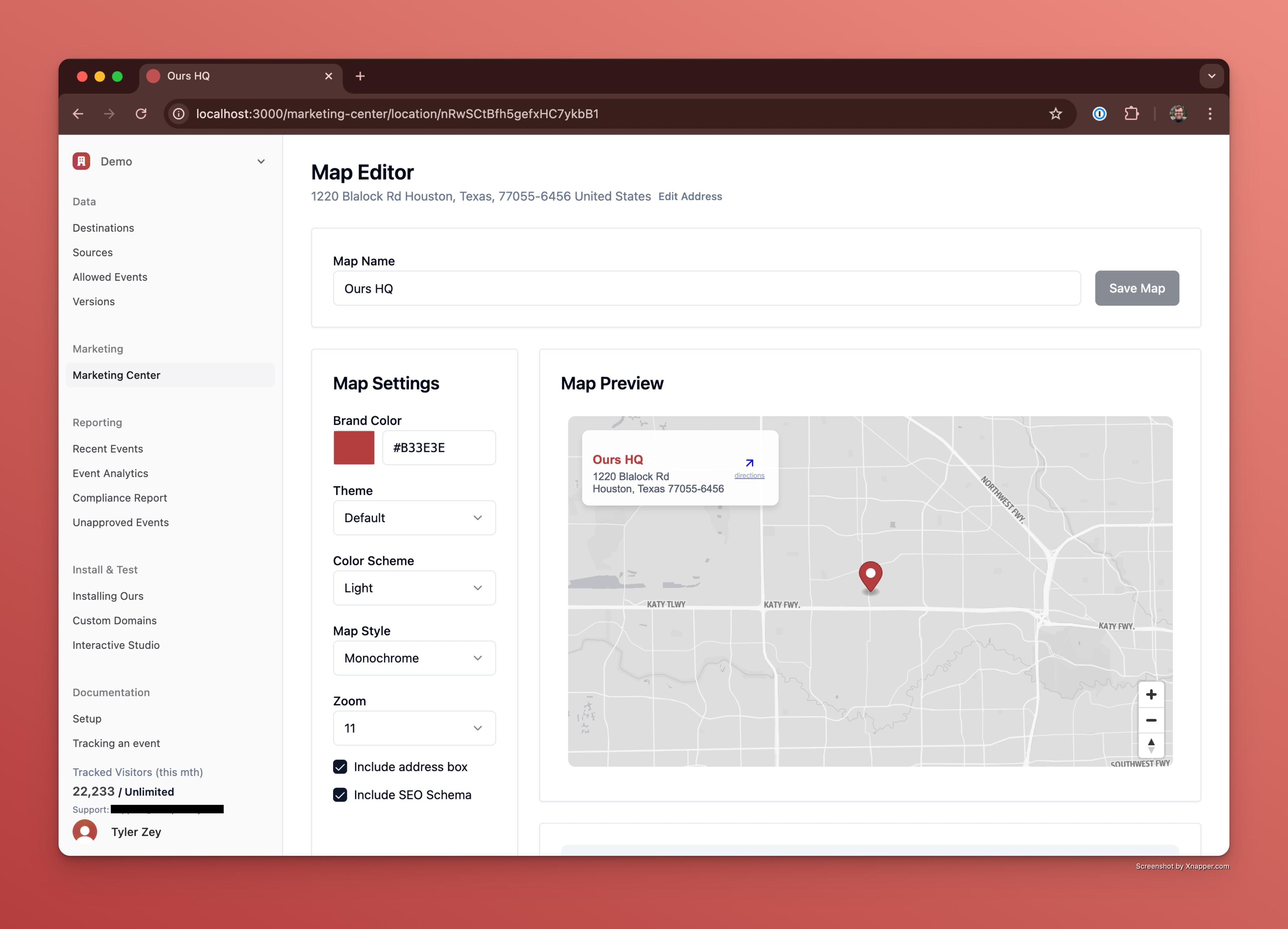 - Brand Color: Customize the map interface with your brand color (default: #B33E3E).