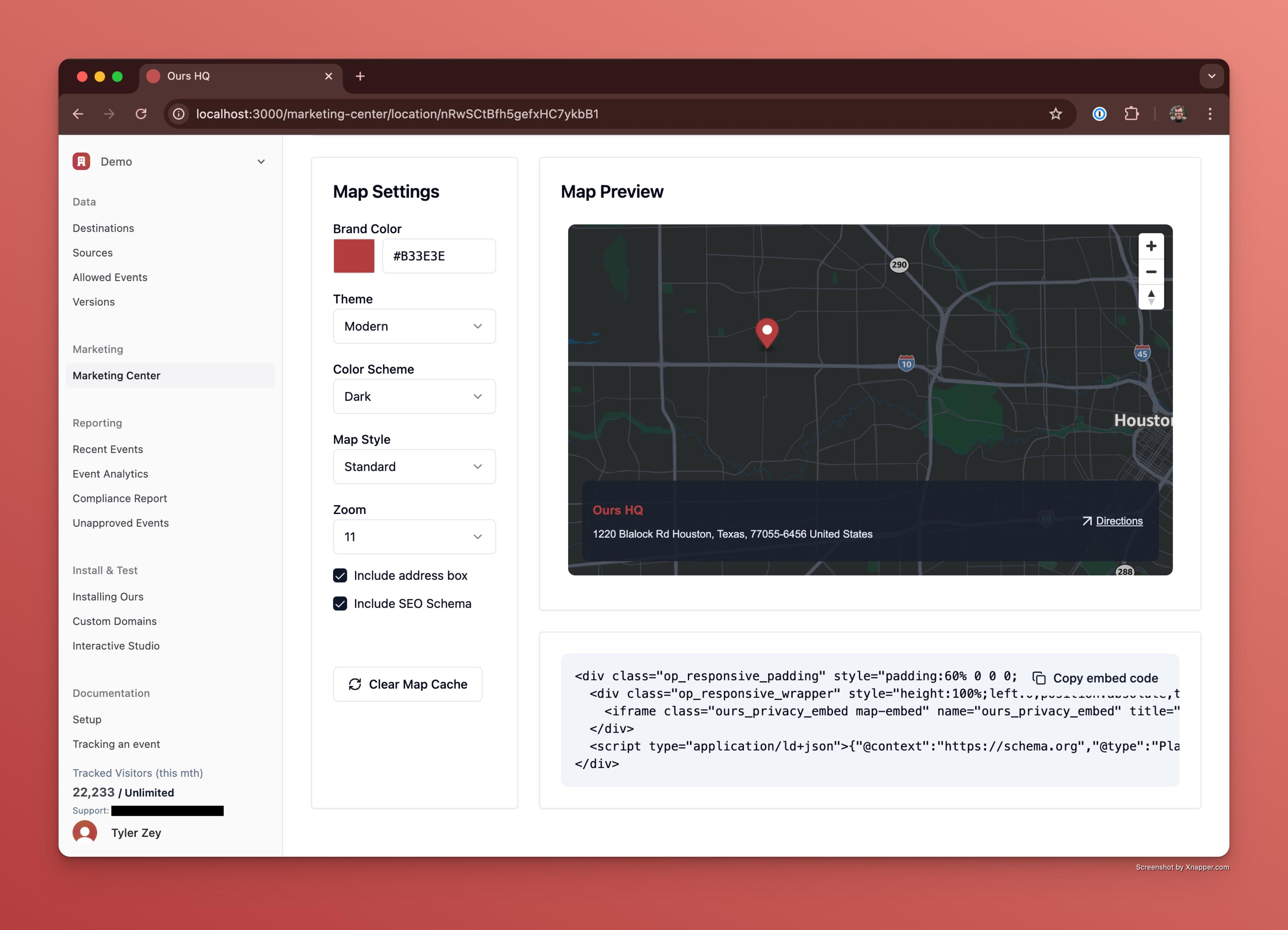 - Easy In-App Creation: Log in to the Ours Marketing Center, create your map, and get an embed code without the need for engineering support.