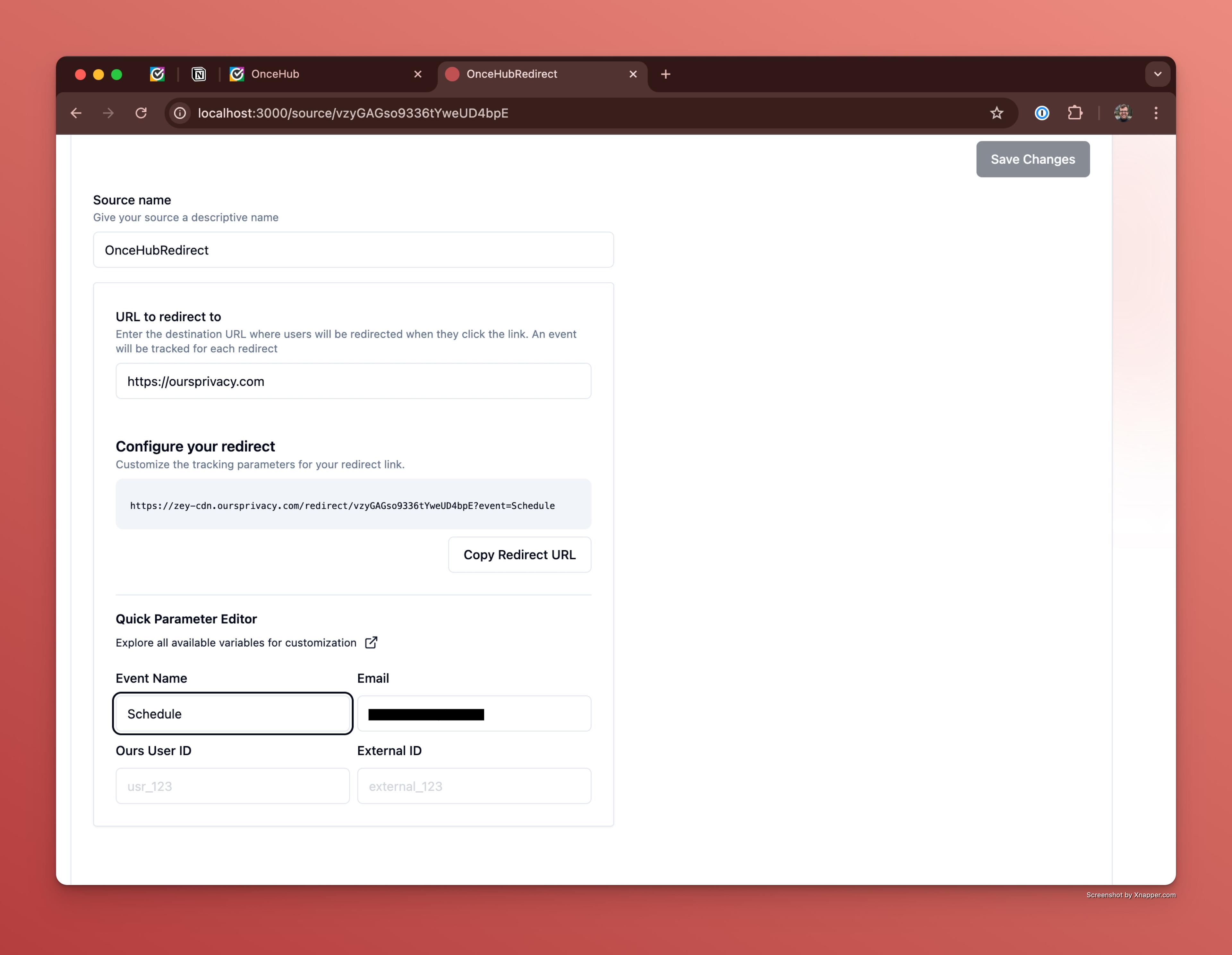 - Create a new Redirect Source in your Ours app and name is "Once Hub"
