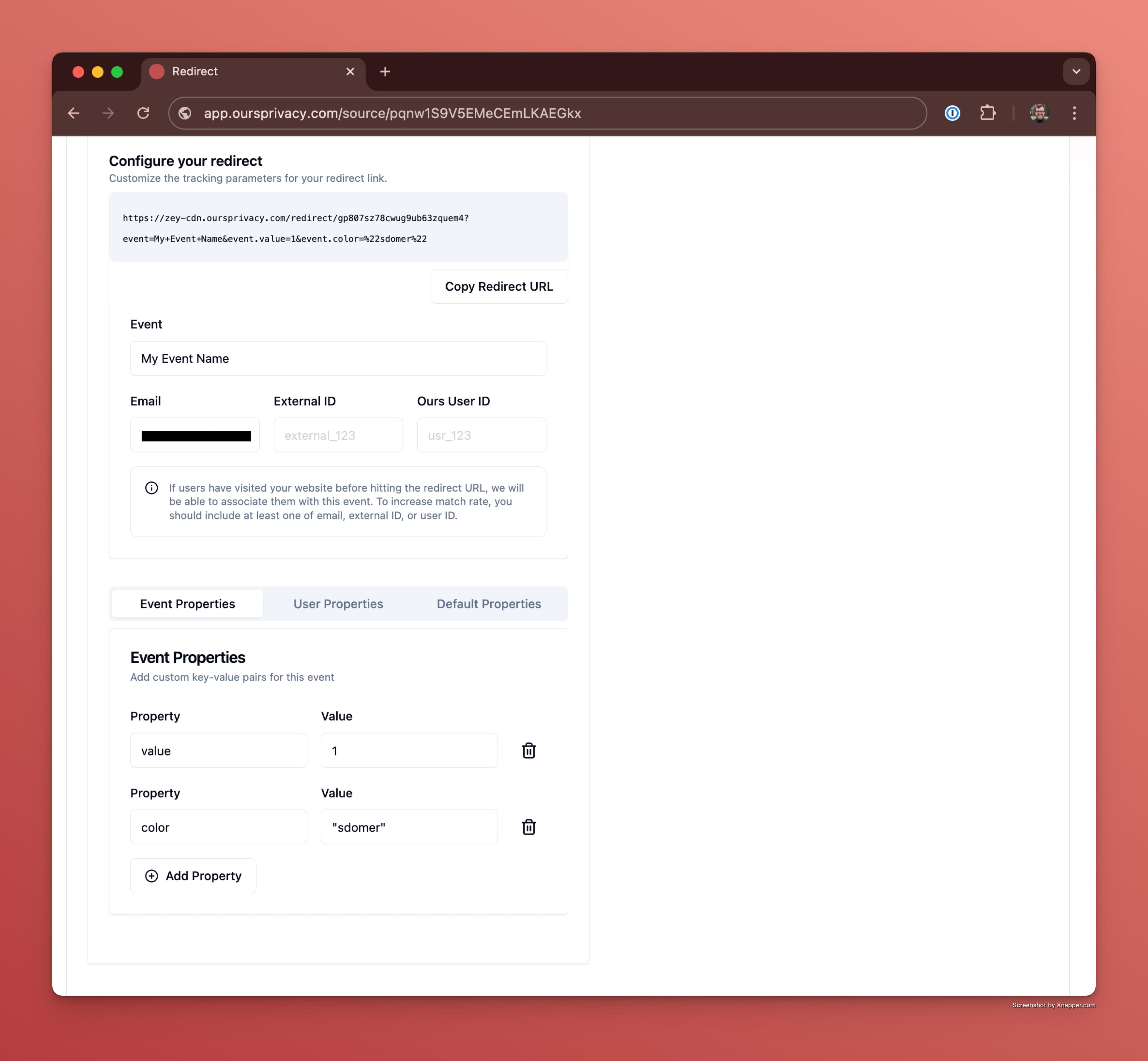 When a user clicks or visits the redirect link, they will be redirected to the URL you specify. The Ours system will then track an event for that user based on the query parameters provided.