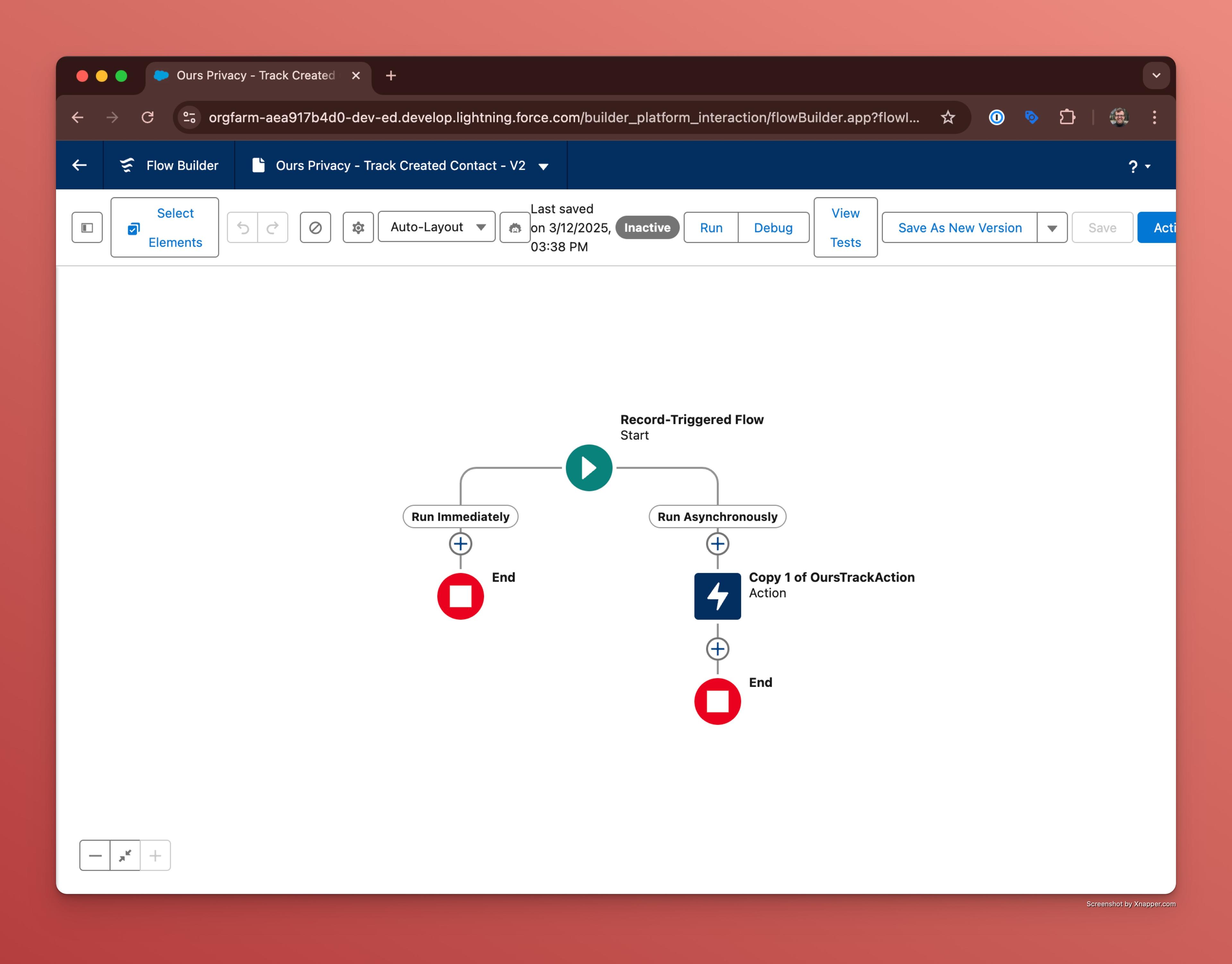- Note: If you are triggering the Ours Privacy Salesforce Action off of a object event (like contact created, account updated, etc), you will need to include the action in an async logic branch of your flow statement.
