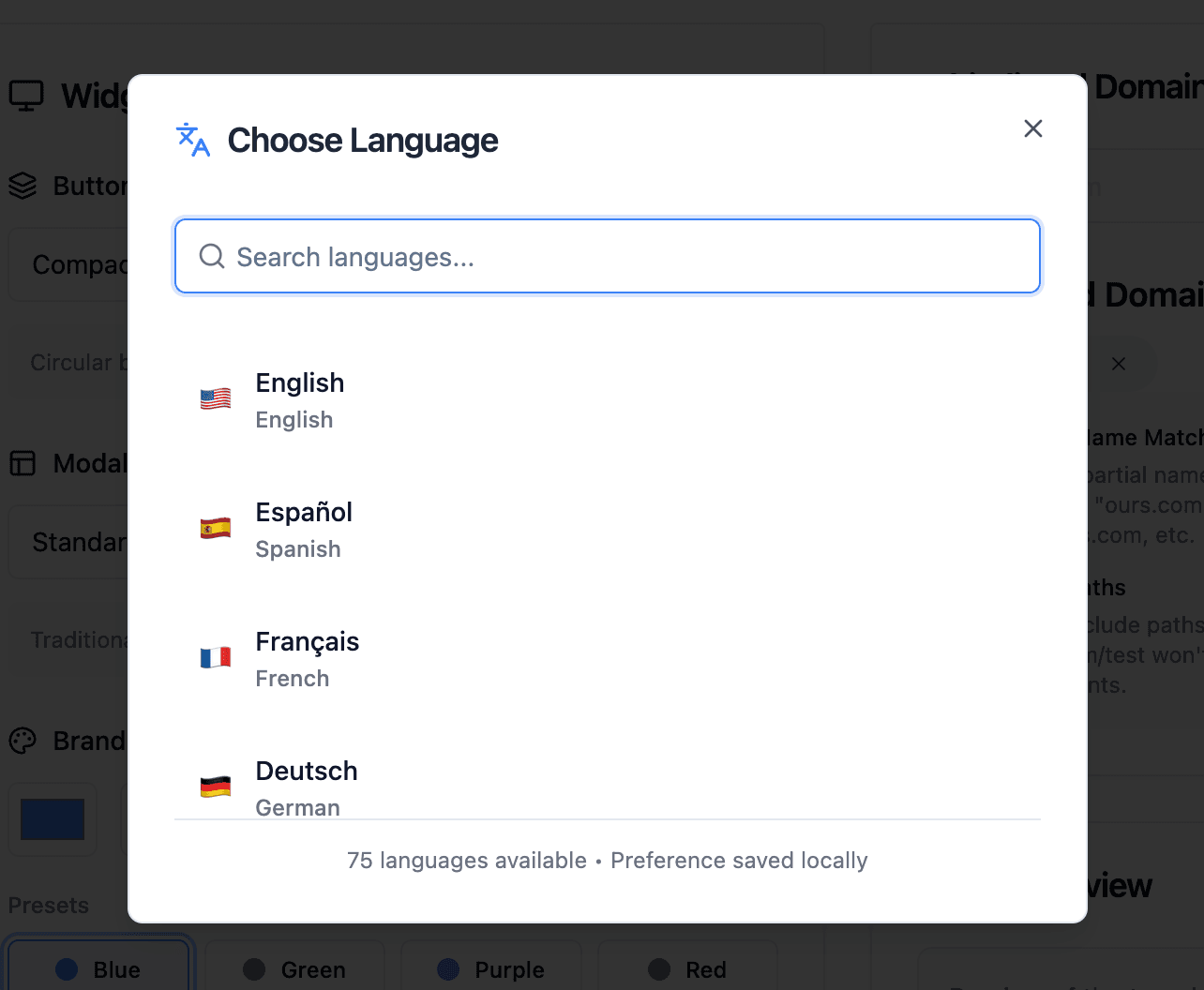 When a visitor lands on your site, they’ll see a floating translate button—styled to match your brand. Clicking the button opens a sleek, accessible modal where they can choose from the languages you’ve enabled. As soon as a language is selected, the widget quickly gathers all visible text on the page (skipping hidden elements and forms), and securely sends it to our translation API.